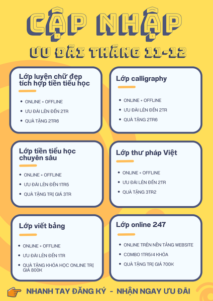 Mùa cuối năm – mùa tri ân học viên, hàng loạt khóa học hot đồng loạt giảm sâu, kèm quà tặng siêu hấp dẫn: 1. Lớp Luyện chữ đẹp tích hợp Tiền tiểu học Hình thức: Online + Offline Ưu đãi lên đến 2ttr Quà tặng trị giá 2tr6 2. Lớp Calligraphy (Chữ nghệ thuật) Online + Offline Ưu đãi đến 2tr Quà tặng trị giá 2tr6 3. Lớp Tiền tiểu học chuyên sâu Online + Offline Ưu đãi đến 1tr5 Quà tặng trị giá 3tr 4. Lớp Thư pháp Việt Online + Offline Ưu đãi đến 2tr Quà tặng trị giá 3tr2 5. Lớp viết bảng Online + Offline Ưu đãi đến 1tr Tặng khóa học online trị giá...