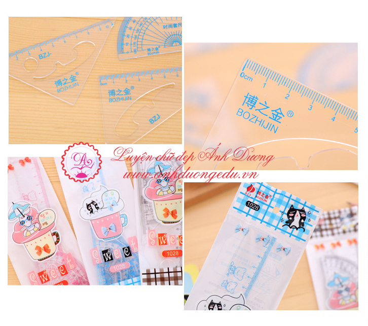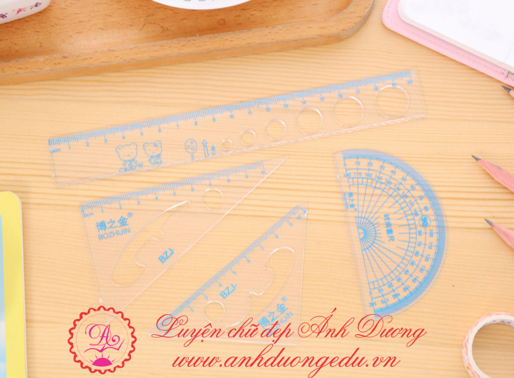 - Bộ sản phẩm gồm 4 thước: 1 thước kẻ dài 20cm với các lỗ hình tròn bên trong, 2 thước ê ke tam giác, 1 thước đo độ