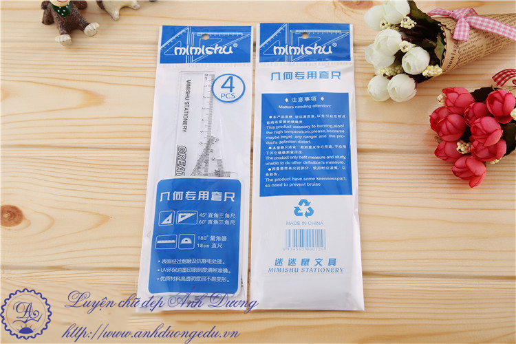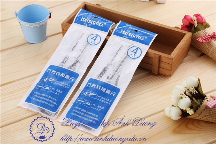 - Bộ sản phẩm gồm 4 thước: 1 thước kẻ dài 18cm với các lỗ hình tròn bên trong, 2 thước ê ke tam giác, 1 thước đo độ