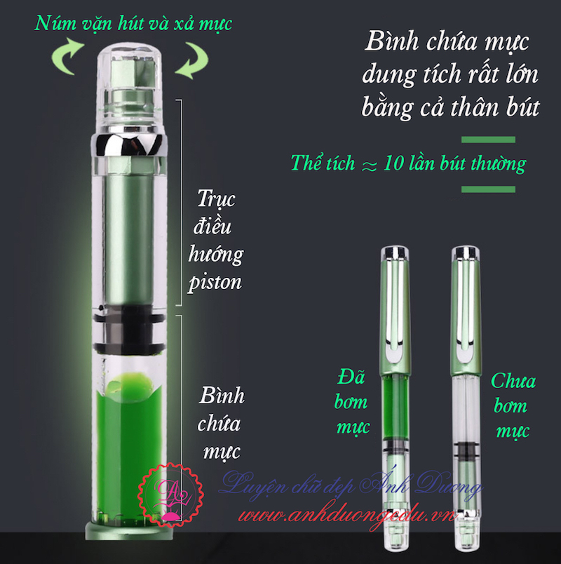 - Phần bơm mực hoàn toàn bằng thân bút nên không cần phải mở nắp phần thân dưới ra để bơm mà chỉ cần cắm thẳng cây bút vào lọ mực và xoáy bằng nuóm vặn bút và xả mực là xong