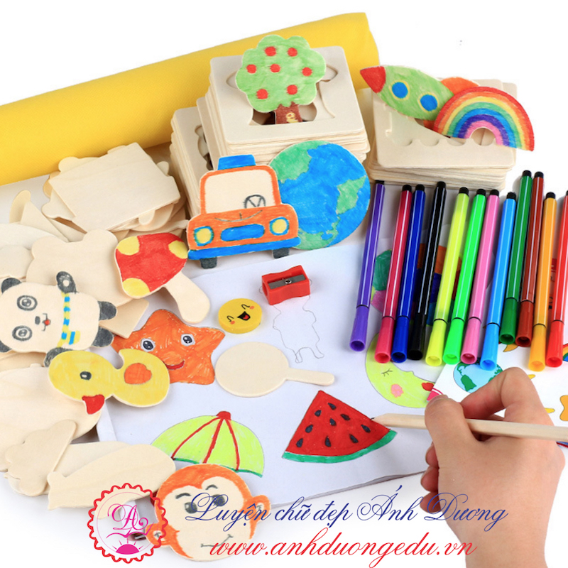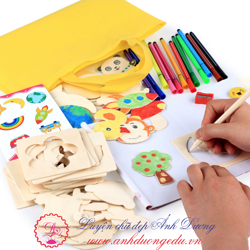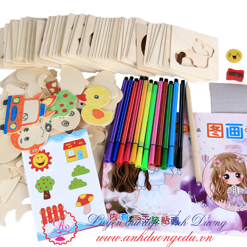BỘ SẢN PHẨM GỒM: 50 khuôn gỗ ép chưa tô màu, 12 cây bút dạ màu, 1 bút chì, 1 tẩy, 1 gọt bút, 1 sổ giấy trắng dùng để vẽ, 1 tờ hướng dẫn tô màu và 1 túi đựng sau khi chơi xong
